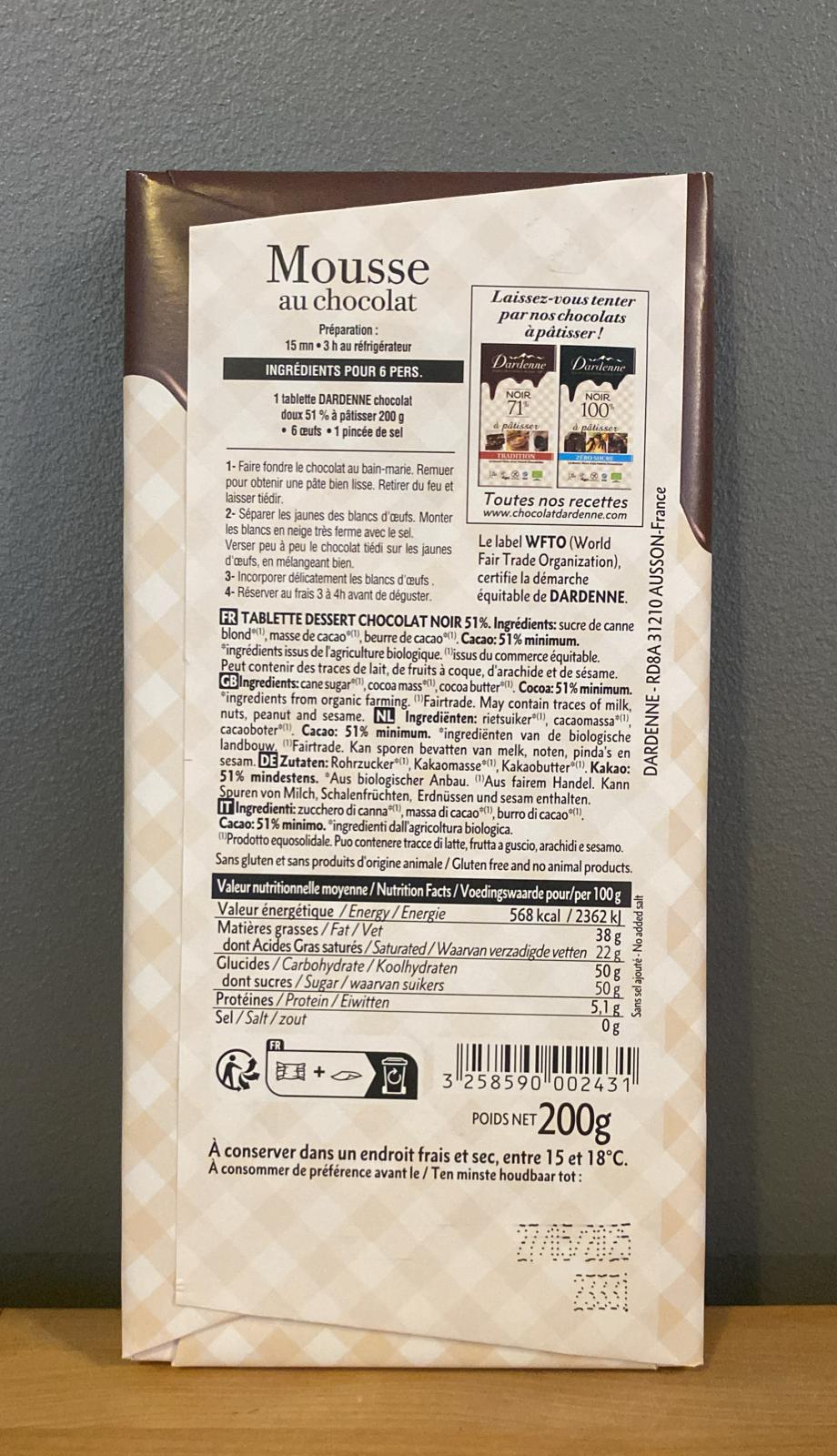Chocolat noir dessert 51% Vegan – sans gluten 200 g