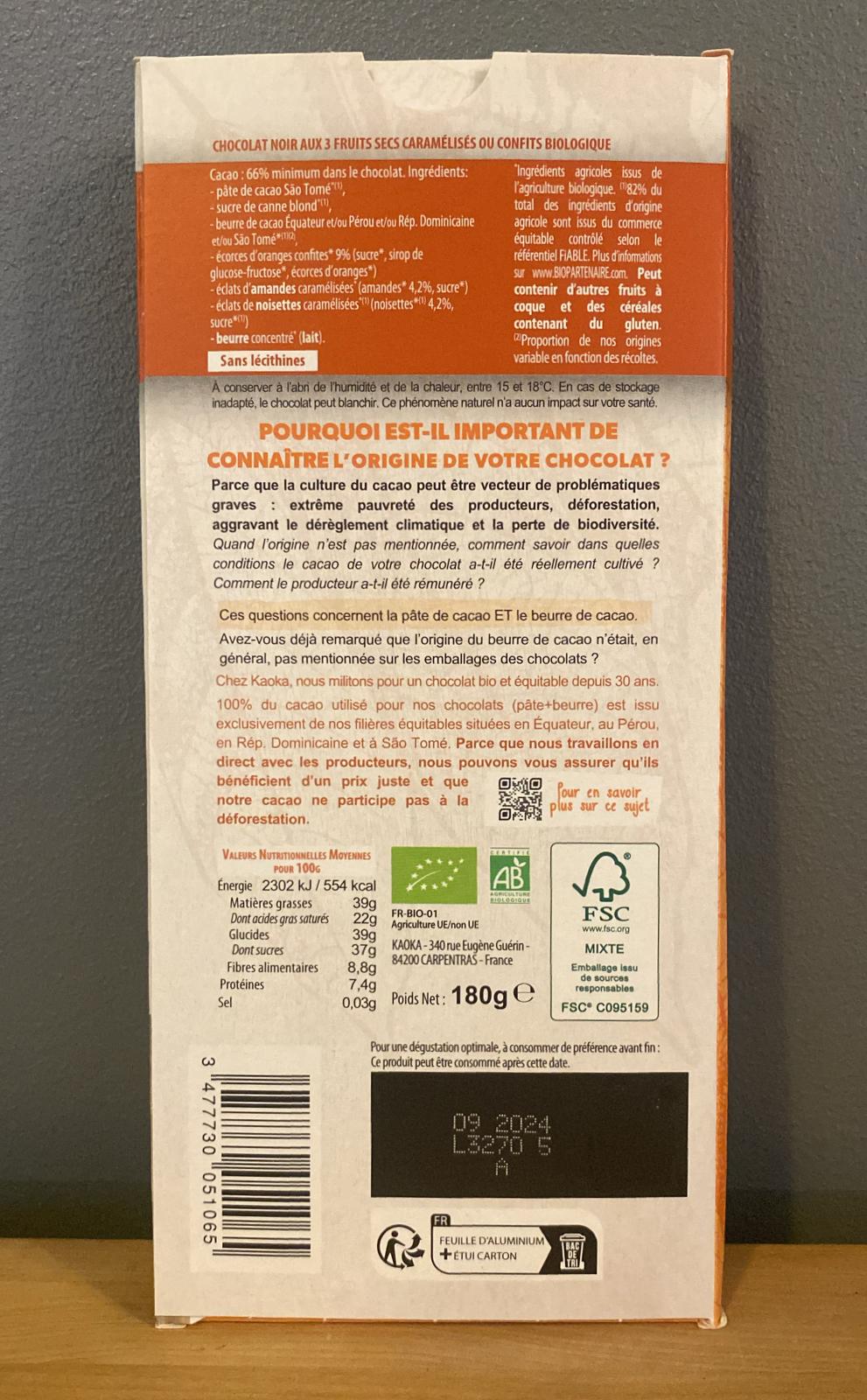 Chocolat noir 66% aux fruits secs caramélisés ou confits Sans lécithine 180 g
